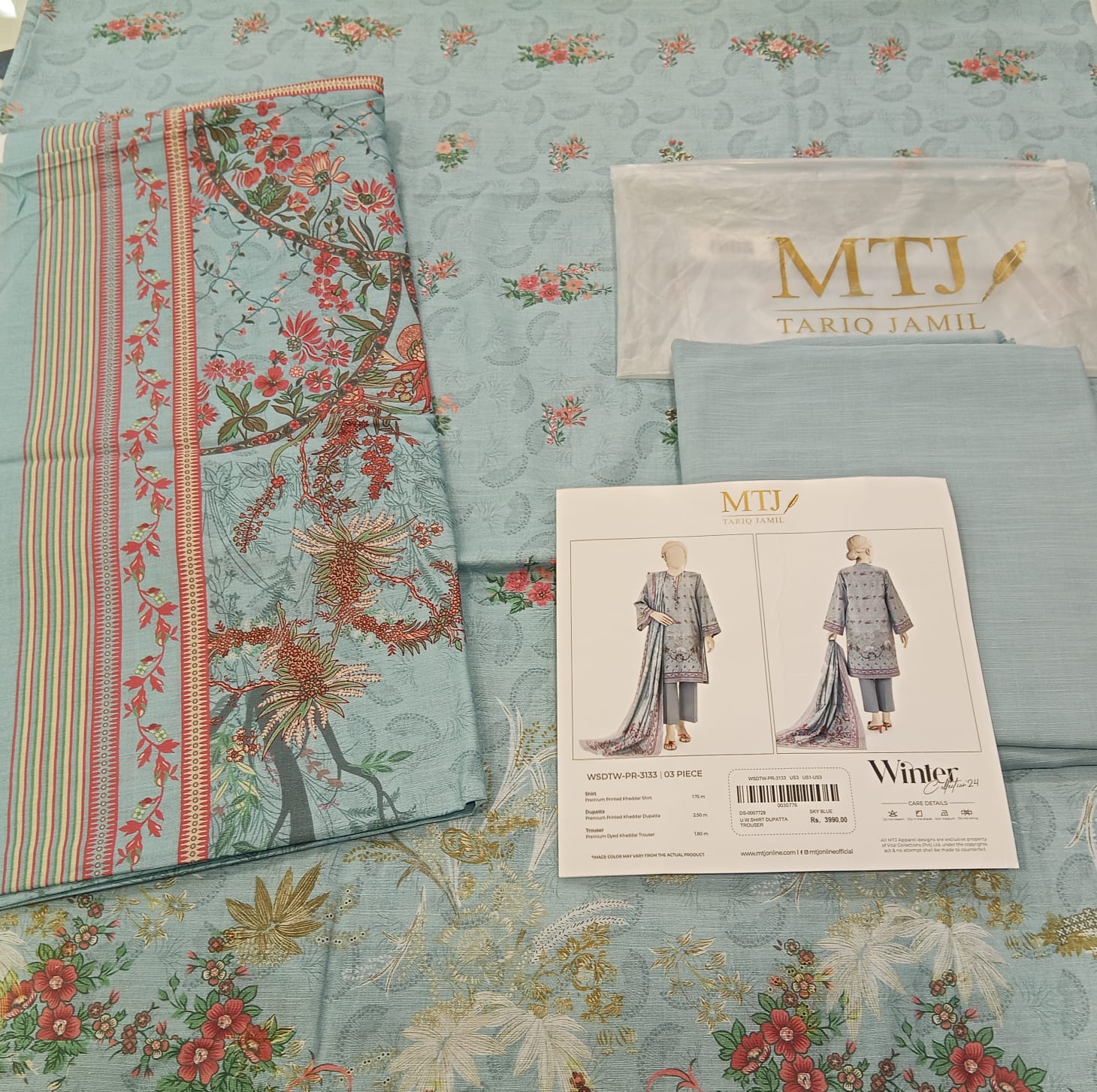 Sky Blue | Mtj-Tariq Jamil 3pc Unstitched Khaddar Suit